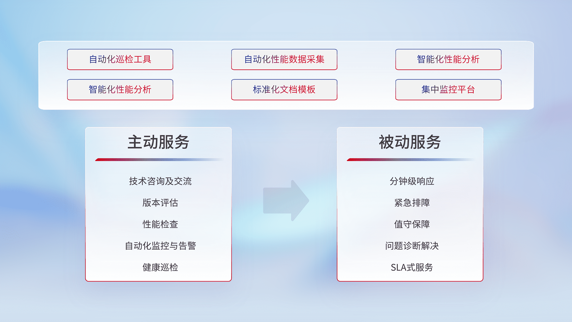 智能化工具和标准化文档,,保障服务质量,,,,提供主动服务(包含技术咨询、、、版本评估、、、、性能检查、、、、自动化监控与告警、、、、健康巡检)和被动服务包含(分钟级响应、、、、紧急排障、、值守保障、、问题诊断解决、、SLA服务)。。。